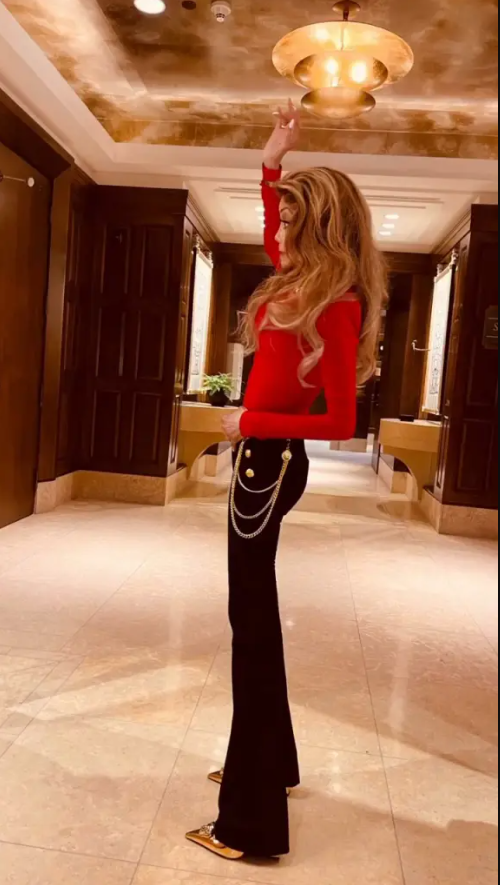The 69-year-old singer posted images on Monday wearing a long-sleeved red top, black pants and gold pointed heels, accessorized with a chunky chain belt and a bracelet. Her slender figure was especially striking in a side-profile pose included in the montage.