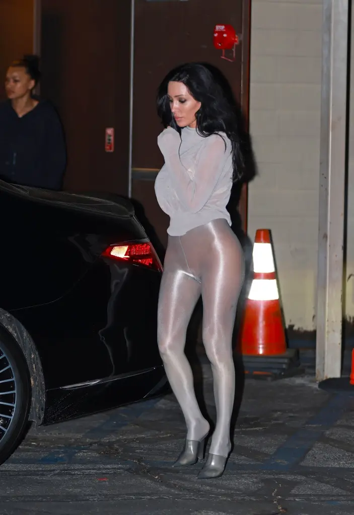 The 31-year-old model and architect wore a metallic bra paired with matching tights, layered under a sheer long-sleeved top featuring buttons down the back. She completed the look with transparent silver wedge heels and subtle waves in her dark hair. Censori’s makeup included a silver-glam eyelid look that perfectly matched her ensemble.