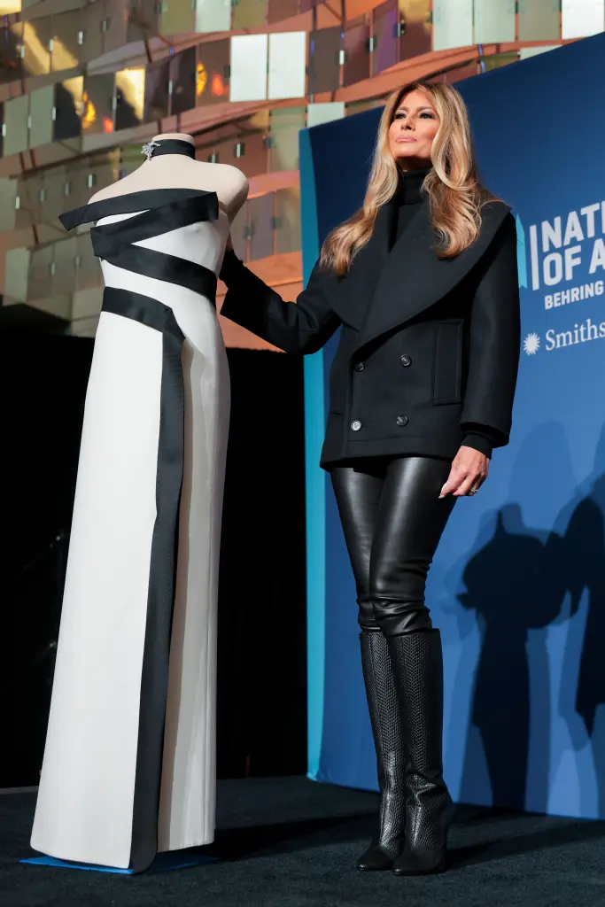 Melania Trump marked the donation of her second inaugural gown to the Smithsonian National Museum of American History on Friday, appearing in an all-black outfit that complemented the historic dress.